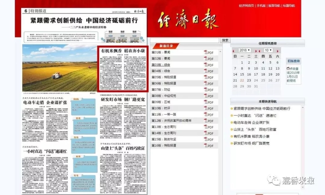 10月22日,經(jīng)濟(jì)日報(bào)特別報(bào)道刊發(fā)了《有機(jī)稻米飄香 稻農(nóng)奔小康》一文。