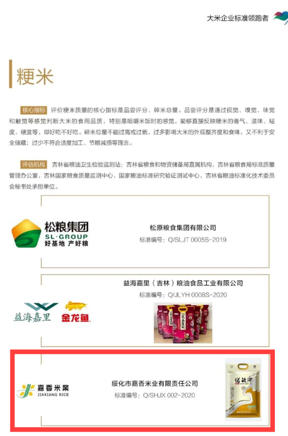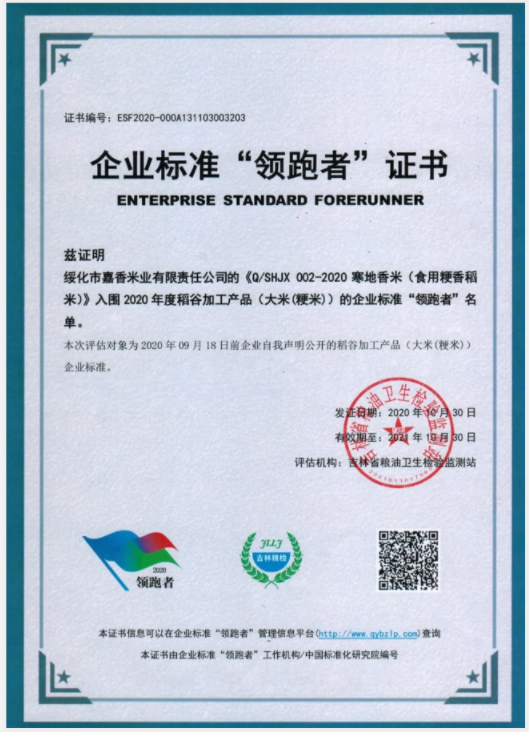 近日,由國家糧食和物資儲備局標準質(zhì)量中心評選的“2020年糧油產(chǎn)品企業(yè)標準領(lǐng)跑者”名單公布,綏化市嘉香米業(yè)有限責任公司憑借旗下優(yōu)質(zhì)品牌香米“鳳香苗稻香”,獲得該榮譽稱號。